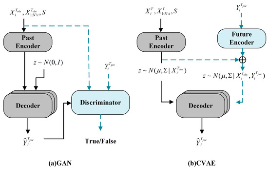 Figure 2a illustrates that GAN consists of a generator and a discriminator. The former generates diverse trajectories by introducing random noise. The latter distinguishes the trajectories predicted by the generator from the observed ones, making the generated trajectories more realistic and diverse. Kosaraju et al. [