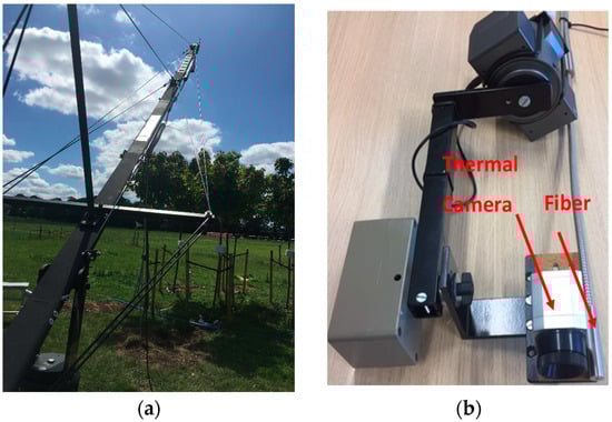 (a): The portable crane used for the top-of-the-tree canopy reflectance measurements. (b): Thermal camera and fibre optic attached on the powerhead.
