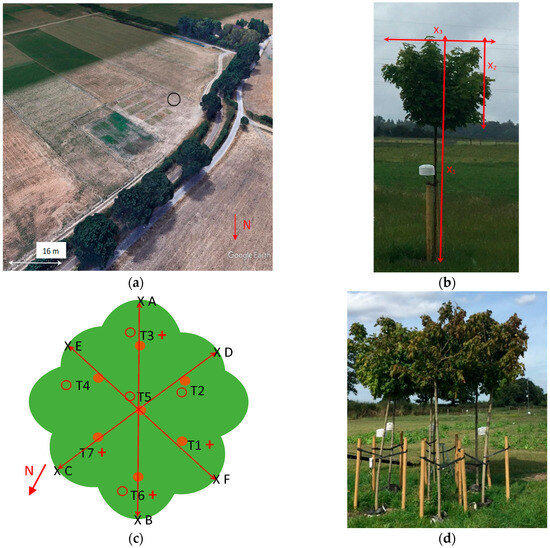 The location of the experimental site (Shinfield Farm of the University of Reading 51°24′45.4″ N 0°54′39.4″ W). The site is depicted with the circle (a). Tree T7 and the main dimensions discussed in text: height of the tree (x1), vertical extent (x2), and diameter of the canopy (x3) (b). Schematic representation of the tree cluster. Filled circles and Ti for i = 1:7 denote trees, and the names of the trees respectively; ‘x’ symbols show the location of the points A, B, C, D, E, and F. Distances AB, CD, and EF are 3 m, 3.10 m, and 2.60 m, respectively. Dimensions shown are not to scale. Open circles and crosses denote soil moisture and air temperature sensors, respectively (c). The tree cluster, as seen from northwest ( (d).