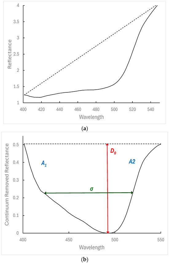 Example of continuum analysis for the absorption features between 400 nm and 550 nm for one of the canopy reflectance spectra shown in Figure 6: (a) measured reflectance spectrum between the two continuum endpoints of the feature (400 nm and 550 nm) and continuum line; (b) continuum-removed spectrum showing the main absorption features: absorption depth (D0), width of the absorption center (full-width of feature at half-maximum absorption depth—σ), areas at the left and right of the absorption center (A1 and A2, respectively).