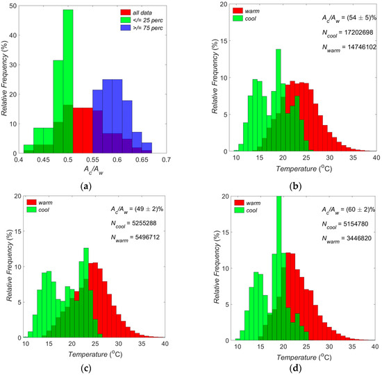 Histograms of relative frequency of the between cool and warm temperatures (a); surface temperature corresponding to all values (b); values in the first quantile (c); and values in the third quantile (d) of the parameter. Parameters listed in (b–d): cool to warm ratio: average (±standard deviation) of the parameter; Ncool (Nwarm): number of pixels used to create the cool (warm) area histogram.