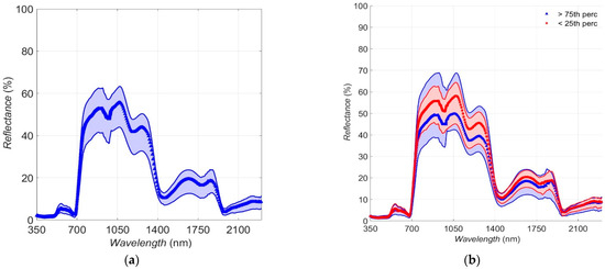 Composite plot of canopy-level reflectance spectra for (a) all measurements (104 individual spectra taken on 13 August 2019) and (b) measurements corresponding to the third (>75th) and first (<25th) quartiles of the ratio. Median reflectance is plotted as a solid thick line; the range between 5th and 95th percentiles as shaded areas.
