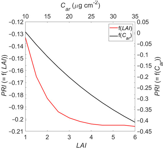 The biochemical and biophysical attributes of the warmer and cooler areas of the canopy for the given geometry of our measurements were investigated in a series of modelling runs with the well-known PROSPECT-5D [45] and PROSAIL-5D [46] radiative transfer numerical models: PROSPECT gives the reflectance and transmittance at leaf level and PROSAIL (that is, a fusion of PROSPECT and SAIL models) at canopy level. The codes used can be found at http://teledetection.ipgp.jussieu.fr/prosail/ (accessed on 1 January 2025). Model runs were conducted in both direct and inversion modes. In the inversion mode biophysical and biochemical properties of the leaf and canopy were extracted from the experimental measurements (Section 3.4). In the direct mode, the input parameters of the model are given, and the reflectance is calculated; this was used to test the sensitivity of the Photochemical Reflectance Index (PRI) to input Leaf Area Index (LAI) and carotenoid content values (Section 3.5).