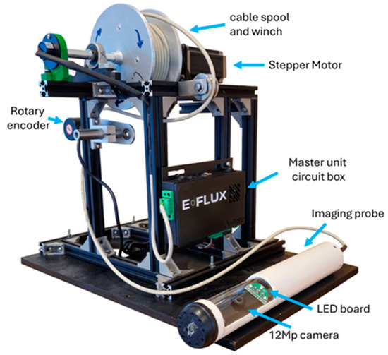 The instrument described in this work allows the collection of pictures below the ground surface using a proprietary design ([15], E-Flux, Fort Collins, CO, USA). The apparatus consists of an Imaging Probe that includes light sources and a camera that takes pictures of the soil. The light sources comprise LEDs (currently two sets, one of white lights and one of a 365 nm UV light, from CreeLED, Inc., Durham, NC, USA and Luminus, Inc., Sunnyvale, CA, USA, respectively) to enable imaging under different excitation wavelengths. Additionally, the system has a Master Unit and a Graphic User Interface (GUI), which coordinates the probe movement, the collection of images, and defines the vertical interval of the domain to be surveyed. Figure 1 shows a picture of the Imaging Probe and the Master Unit. The probe includes a 12 MP (megapixel) camera (Arducam Technology Co., Ltd., Hong Kong, China), which uses a SONY IMX477 sensor (Sony, Kumagoto, Japan). The camera is fitted with a 140° (fisheye) lens and an LED board. The probe is lowered through a cable into a dry well made of standard PCV casing with clear openings lined with borosilicate glass (see the following section for a complete description). A microcontroller (Arduino, Lombardia, Italy) controls the probe and a cable spool to lower the probe. The probe is aligned with the glass openings in the dry well by a magnetic field created by magnets mounted in the probe and on the dry well. A portable computer connected to the microcontroller runs a graphical user interface (GUI) to program the system and display the status of the Imaging Probe.