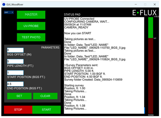 The GUI runs on a laptop with Windows 10 OS. The GUI input parameters include the dry well vertical dimensions and the clear portion of the dry well to be surveyed. It is typical for well casing materials to stick above the ground surface and to code the position along the well casing using length units below the ground surface (BGS). The surveys use the ground surface as a datum, with the starting probe location at the open top edge of the well casing. The difference between the ground surface and the upper open edge of the well casing is entered as the offset (as a negative length). Hypothetically, a positive offset would indicate if the top of the well is below ground surface (for example, locations secured through a metal vault finished at ground surface, common for areas with active traffic). The GUI also reports the status of the current survey (the current probe location). A log file is saved on the laptop computer with all the parameters shown in the Status Pad of the GUI (Figure 3).