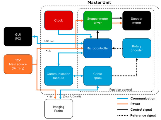 Master Unit block diagram and its relationship to the GUI (located on a portable computer) and the Imaging Probe.