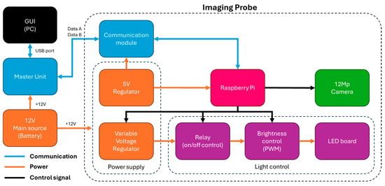 The Imaging Probe includes the camera and light sources. The probe includes a local microprocessor (Raspberry Pi Zero 2 W, Cambridge, UK) and takes pictures triggered by the Master Unit. The control diagram is shown in Figure 5. It is programmed using Python 3 (version 3.11.9) to control the light sources and the operating parameters of the camera (specific to each light source). The Imaging Probe has two voltage regulators: (i) a 5 V regulator for the Raspberry Pi and the Communication Module, and (ii) a variable voltage regulator that provides the specific voltage required by the LEDs. The current design of the Imaging Probe includes two different light sources: (i) a white light (4000 K color temperature, or neutral white) and (ii) a UV (365 nm) light source. Each light source consists of two sets of LEDs, centered around the camera to minimize shadows and glare reflections. Each of the top and bottom halves of both light sources is mounted on a single LED board. The white light source has one LED on each LED board, while the UV light source has two LEDs on each LED board. The white LEDs require 3.05 V and draw 350 mA (for a total of 700 mA), and UV LEDs require 3.7 V and draw 500 mA (for a total of 2000 mA). A relay array helps select the light source to use for each picture. A controller regulates the light intensity using pulse width modulation (PWM), which is made through a MOSFET (DMT6009LCT) to control the duty cycle.