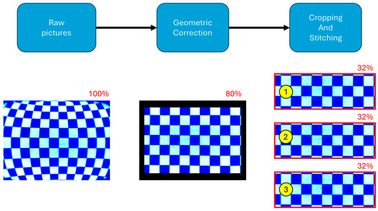 Post-processing block diagram and example using a checkerboard for calibration. The percentages shown indicate the image height preserved in each step, with respect to the original, raw image.