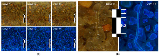 Selection of illustrative surveys of a basil plant root growth section. (a) The left panel shows images obtained under visible lights (top) and under UV lights (bottom) at 7, 10, and 14 days after the appearance of the first root in the image. (b) The right panel on the right shows a zoomed-in image with details of the root structure.