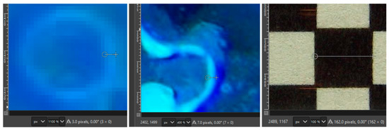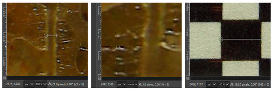 The formation of thin films after draining was used to estimate the maximum resolution of the camera (see Figure 10). A checkerboard grid of 2 mm × 2 mm squares was printed on a laser printer and taped on a glass tube identical to that installed in the tank. The square dimensions were measured using the measure tool in GIMP [19]. The average 2 mm square dimensions (from 20 repetitions) were equivalent to 160.6 pixels (with a coefficient of variation of 4%). This results in an average pixel width of 12.5 µm. As a reference, the soils with the smallest particle sizes are silt and clays, with particles in the order of 20 and <5 µm, respectively [20]. Then, a similar analysis of two areas of the UV pictures with NAPL thin films yielded a sheen thickness of 3–4 pixels, equivalent to ~35–50 µm. This thickness is near or slightly below that of a human hair [21].