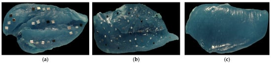 Utilizing the SWIR HSI system, each fillet was imaged under two conditions: clean without FMs first and contaminated with FMs for later imaging. The contamination involved 30 distinct types of FMs commonly found in poultry processing environments, such as polymers, metals, and wood, detailed in the prior work [10,12]. The target sizes of FMs were approximately 2 × 2 mm (small) and 5 × 5 mm (large). Each fillet for imaging was placed on a blue food-grade polyurethane conveyor belt background. In total, 48 SWIR hyperspectral images were collected: 24 clean and 24 contaminated (12 with each size of FM). These SWIR hyperspectral images (1000–2500 nm) were subsequently transformed into NIR hyperspectral images with 95 spectral bands from 1000 to 1700 nm. Figure 1 shows three exemplar RGB pseudo-color images derived from clean and contaminated NIR hyperspectral images utilized in this study.