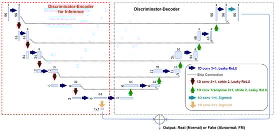• Discriminator: The discriminator adopts a 1D U-Net architecture, consisting of an encoder and a decoder, to process spectral vectors at individual pixel locations (x,y). Before being sent to two GAN modules, the input spectral vectors are initially subjected to clustering into two groups using a 1D Gaussian Mixture Model (GMM). This clustering segregates the spectral data into distinct clusters representing muscle and non-muscle external tissues, which are then processed by their respective discriminators for further analysis. Note that this GMM module for spectral clustering is only necessary during the model training phase. During the inference, only the encoder part of the two discriminators is utilized. Therefore, the inference model consists of two pre-trained GAN discriminator encoders. The overall architecture of the discriminator is shown in Figure 3. The discriminator outputs probabilities that are thresholded and further processed for binary classification at each pixel, indicating the presence (1) or absence (0) of FM, as previously described. For the GAN discriminators, a dummy band was added to each spectrum, resulting in a final spectrum size of 96.