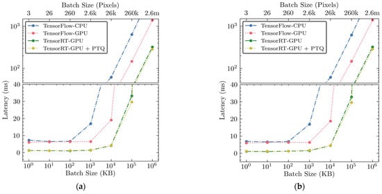 • Static and Dynamic Batch Size: When setting the input shape in TensorRT, a batch size affects performance. Static and dynamic batch sizes are compared in this study. A static batch size refers to a fixed one that does not change at runtime, whereas a dynamic batch size is a variable batch size that can change at runtime, providing flexibility to handle varying batch sizes. The static batch sizes used are 1 KB, 10 KB, 100 KB, 1 MB, 10 MB, 100 MB, and 1 GB. The dynamic batch size was defined using three parameters: minimum, optimal, and maximum values. An inference engine configured with a dynamic batch size works for all batch sizes within the [minimum, maximum] range and is optimized for performance at an optimal size within the range. The minimum size ensures responsiveness and quick processing for smaller data inputs, the optimal size provides the best performance in throughput and resource utilization, and the maximum sets the engine’s upper limit to manage the largest expected data volumes efficiently. In the study, the static batch sizes were set as the optimal sizes, and the ranges were defined as follows, [1, 10], [1, 50], [1, 500], [1, 5000], [1, 50,000], [1, 500,000], and [1, 5,000,000] (the number of pixels). A comparative experiment was designed to evaluate the performance of the static and dynamic batch sizes.