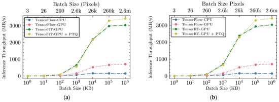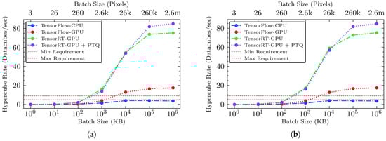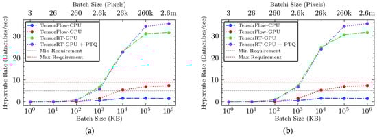 The calculation of the hypercube rate was based on the throughput rate (measured in batches per second or MB/s) and the batch size (measured in pixels per batch or KB). The hyperspectral imaging conditions configured with the two hypothetical NIR and SWIR hyperspectral cameras (see Section 2.4.1) required 107,520 and 256,000 pixels, respectively, to capture a hyperspectral image (i.e., a hypercube) with the camera’s maximum spatial dimensions for scanning a halved broiler breast fillet entirely. The SWIR camera can be described as a 256k-pixel SWIR camera with 96 bands, while the NIR camera can be referred to as a 108k-pixel NIR camera with 96 bands. By relating the throughput to these pixel requirements, we established a metric that provides a realistic gauge of performance across different operational scales and batch sizes for each inference engine examined.