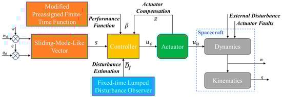 In Figure 1, variable is sliding-mode-like vector, proposed to limit the angular velocity and designed in Section 2.2.3. The modified preassigned finite-time function is developed to constrain vector s in Section 2.2.1. The actuator faults and system external disturbance are estimated using a disturbance observer in Section 2.2.2. The actuator compensation variable is applied to design controller in Section 2.2.3. is the actual output of the actuator, which affects the spacecraft dynamics model.