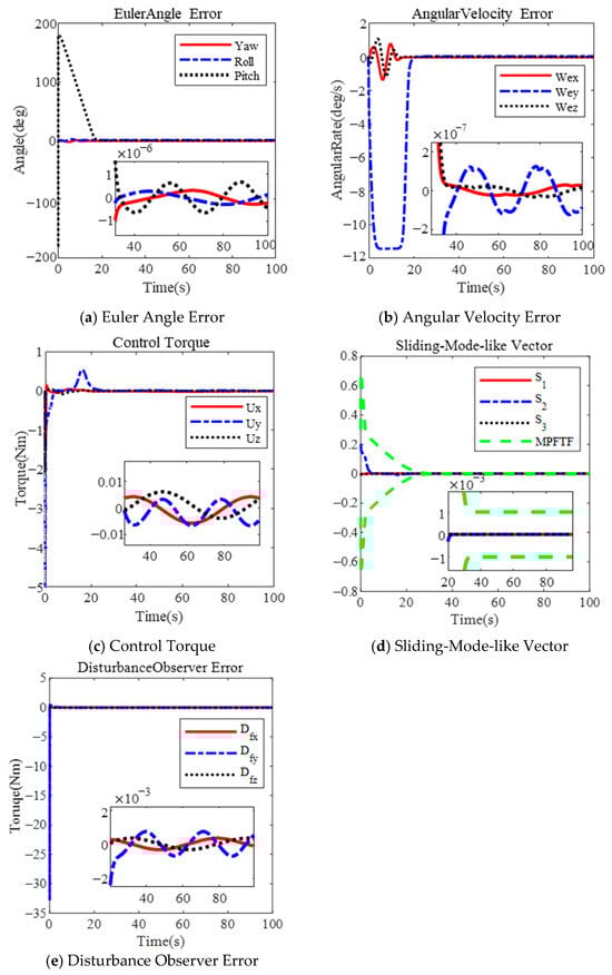 Similarly, the results for are shown in Figure 3. The maximum angular velocity reaches 17.26 deg/s, as illustrated in Figure 3b. The Euler angle error and angular velocity error are and , respectively, within 35 s, as shown in Figure 3a,b. The sliding-mode-like vector reaches the steady boundary within 20 s, in Figure 3d. Clearly, increasing the parameter λ can shorten the convergence time; however, it also leads to a larger angular velocity. Additionally, the disturbance observer error is , as shown in both Figure 2e and Figure 3e.