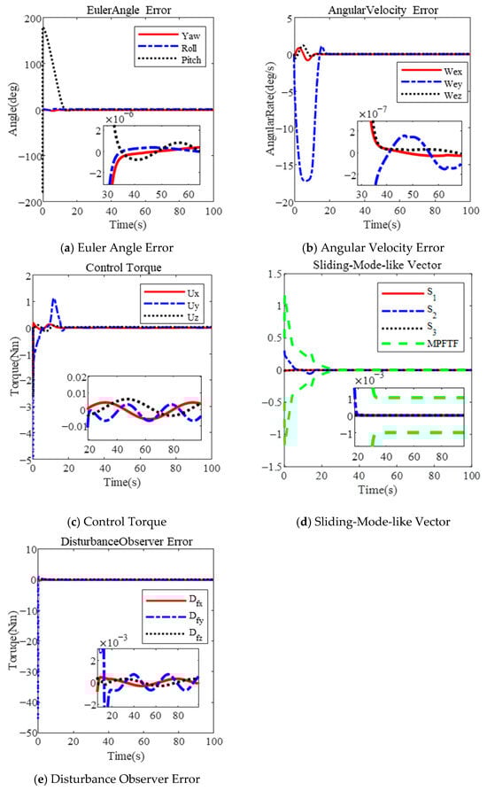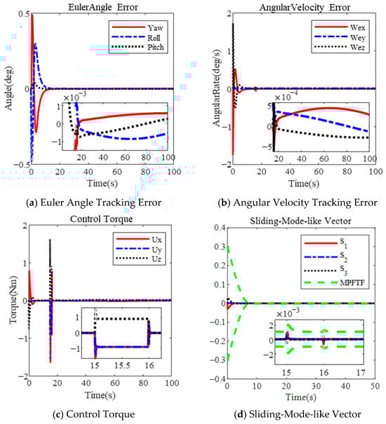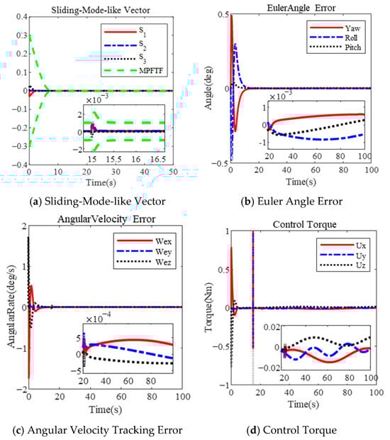 Figure 2 presents the results for . The Euler angle errors are shown in Figure 2a, and the angular velocity of the spacecraft is depicted in Figure 2b. The Euler angle error is , and the angular velocity error is within 38 s. The maximum angular velocity reaches 11.56 deg/s. The physical limitations of the actuator are not violated, with the control torque shown in Figure 2c. The sliding-mode-like vector’s performance is shown in Figure 2d, converging to the steady-state boundary within 25 s.