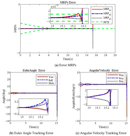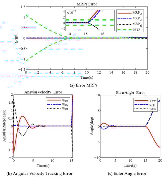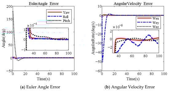 The results using the PFTF are shown in Figure 4. It is obvious that the maximum angular velocity is 50.56 deg/s during the large-angle attitude maneuver in Figure 4b. The final Euler angle error and angular velocity error are and after 38 s. Due to the excessive angular velocity, attitude stabilization becomes difficult.