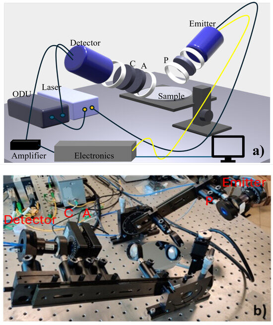 We utilized a custom-built THz time-domain ellipsometer (Figure 1), featuring a femtosecond laser source fiber-coupled to two photoconductive antennas for coherent THz pulse emission and detection. Polymeric TPX (polymethylpentene) lenses are used to collimate and focus the THz pulse. Three conductive wire grid polarizers (WGPs), marked by P, A, and C in Figure 1, are employed to control, detect, and compensate the polarization state, respectively. This setup, compared to previous designs, provides enhanced precision and reliability [28]. Its flexible design and accurate calibration, mentioned in detail in our previous work [24], enable precise probing of liquid polarization responses in the sub THz range. The opto-mechanical design permits changing the incident angle in a wide range () with an accuracy of . The THz spot size at the focal length of focusing lenses is approximately 5 mm. Further details on the measurement setup can be found in [29]. In time-domain ellipsometric measurements, the p-polarized and s-polarized electric fields reflected from the sample surface are recorded [30]. Afterward, we obtained frequency-dependent information on both the amplitude and phase of the reflected signals using fast Fourier transform (FFT) analysis, from which we directly retrieved the ellipsometric parameters () defined as the amplitude ratio and the phase difference of the p- and s-polarized states, respectively. The ellipsometric parameters () are linked to the complex dielectric response of the material under test [31]: