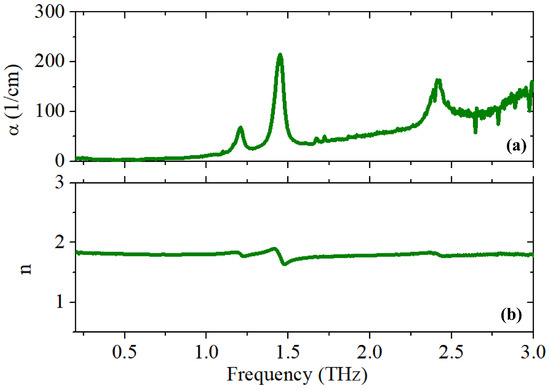 The refractive index n and absorption (directly linked to the absorption coefficient k through the relation , being the electric field wavelength) frequency spectra of pure UA are shown in Figure 2a and Figure 2b, respectively. As illustrated in the graphs, uric acid has two strong and close absorption peaks at around 1.2 and 1.5 THz, which are related to the out-of-plane and torsional vibrational modes, respectively, in the uric acid cluster [33]. A third distinct peak is observed at around 2.4 THz, possibly originating from a further intermolecular vibrational mode at a higher frequency [34].