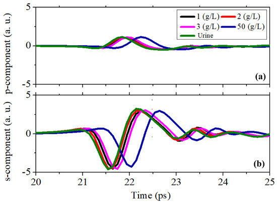 After this preliminary investigation, a set of liquid urine samples with uric acid was tested using the setup in an ellissometric configuration. Figure 3a,b show, respectively, the time-dependent p- and s-polarized components of the electric field reflected from the surface of different liquid samples. The increase in the refractive index produces a shift to the right in the time scale for both components, caused by the increased optical path. The increase in the UA concentration in urine instead reduces the signal intensity of the s-component only, whereas the p-polarized component is almost constant for all samples. This reveals the fact that adding UA to urine does not substantially modify its conductivity [31].