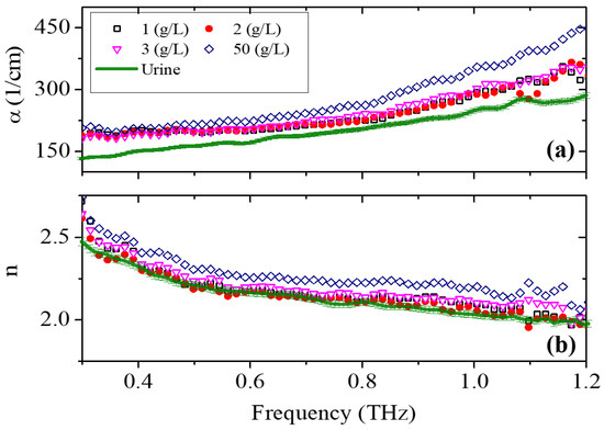 The frequency dependence of the pure urine sample clearly resembles the behavior observed in pure water [35]. The reduction in the frequency bandwidth with respect to the pellet sample is due to the presence of water, which is highly absorptive in the THz region, making the signal-to-noise ratio (SNR) extremely low. Adding UA to the solution (1, 2, 3 or 50 g/L) results in an increase in both and (to a lesser extent) n. This is given by the specific ability of uric acid to form hydrogen bonds with different components of urine, such as urea and salts dissolved in solution [36,37,38].