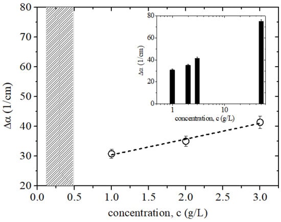 Deviation from the urine absorption by adding UA () is shown in Figure 5, indicating a clear and significant relationship between the concentration and absorption coefficient; this emphasizes that as the concentration of uric acid increases, also increases. Immediately above the limit of the UA physiological level (0.6–0.7 g/L), there is already a consistent change in the absorption values in the overall frequency range investigated. The observed behavior can be employed to quantify the severity of renal diseases. Presented data comprise the mean value of four frequency points (0.6, 0.7, 0.9, and 1 THz). In the inset, the same data are reported in a histogram plot and on a semi-log scale, together with the highest concentration level given by the stock solution.