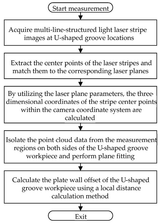 Figure 3. The multi-line-structured light vision sensor captures laser stripe images from the U-shaped groove workpiece surface, and the laser stripe center points are extracted and classified to match their corresponding light plane equations. Then, using the mathematical model of the multi-line-structured light vision sensor, the three-dimensional coordinates of the point cloud data in the camera coordinate system are calculated for the measured area. Subsequently, the point cloud data for the plate wall regions on both sides are isolated. Plane fitting is performed separately on the point clouds of each plate wall region. Finally, the plate wall offset at the U-shaped groove position is calculated using the local distance calculation method between spatial planes.