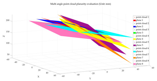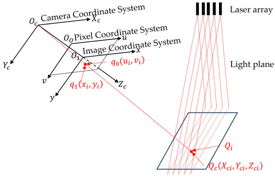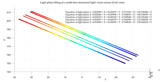 Given , , , and the light plane coefficients , , , and , the point cloud data of the object’s surface corresponding to the laser stripe center points can be obtained through Equations (7)–(9). The calibration of the sensor, which is equivalent to the mathematical model of multi-line-structured light vision sensor measurement, involves determining the parameters in Equations (7)–(9).