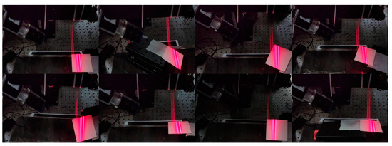 Based on the dimensions of the measured object, the groove top spacing was 80 mm with a depth of 40 mm. The selected camera model was a Basler acA3800-10gm (Basler GmbH, Aachen, Germany), with 3800 × 2748 resolution and 1/2.3″ chip size. The lens was an OPT 8 mm lens, which supports a maximum sensor size of 2/3″. According to the measurement requirements, with the laser generator base as the reference and the light plane perpendicular to the laser generator base, the optimal working distance was set to 170 mm, and the multi-line-structured light vision sensor was calibrated over a -axis range of 130–210 mm. Among them, the -axis resolution was 0.033 mm/pixel, the -axis resolution was 0.033 mm/pixel, and the -axis resolution was 0.045 mm/pixel. The camera field of view was 120 mm × 108 mm at 130 mm and 155 mm × 220 mm at 210 mm, meeting the measurement field requirements.