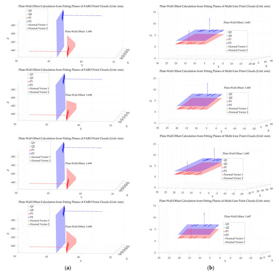 Comparison of plate wall offset measurement results. (a) Plate wall offset measurement results using the FARO flexible articulated arm; (b) plate wall offset measurement results using the multi-line-structured light sensor.