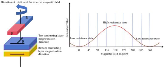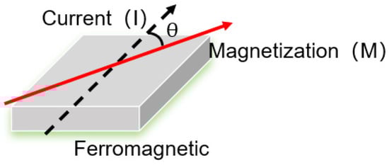 The change in resistance (∆R) depends on the angle (θ) between the current and the magnetization direction of the metal [24], primarily manifested in the influence of the rotating magnetization state in ferromagnetic materials on the direction of the current. In ferromagnetic metals, when the magnetization direction is parallel to the current direction, the resistance reaches its maximum value. When the magnetization direction is perpendicular to the current direction, the resistance reaches its minimum value (Figure 1). The magnitude of the anisotropic magnetoresistance (AMR) in ferromagnetic metals can be calculated using Equation (1). Currently, the AMR effect has been widely applied in miniaturized and high-sensitivity magnetic field sensors. Researchers are exploring materials and structures with even higher sensitivity.