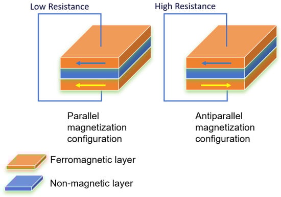 In 1988, Fert and Grünberg independently discovered the giant magnetoresistance (GMR) effect in different laboratories [25]. Their research demonstrated that the change in resistance in thin films composed of alternating layers of ferromagnetic materials and non-magnetic metals (such as copper) can be quite significant, reaching up to several tens of times. This effect is primarily due to the scattering of spin-polarized electrons between different magnetic layers. The high resistance values can be observed when the magnetization of two ferromagnetic layers is anti-parallel, and the low resistance state can be observed when the magnetizations are at a parallel state (Figure 2).