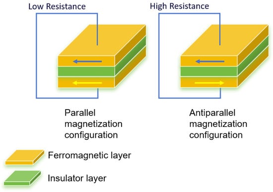 In the 1970s, researchers began to explore the tunneling phenomenon associated with electrons in magnetic materials. Miyazaki and Tezuka were the first to observe that the resistance in a magnetic tunnel junction changes in response to an external magnetic field, a phenomenon that later became known as tunnel magnetoresistance (TMR) [26]. TMR uses a magnetic multilayer configuration similar to that of the GMR. The basic unit of the TMR multilayer system is the magnetic tunnel junction (MTJ), which follows the structure of ferromagnetic metal/insulator/ferromagnetic metal. The insulator layer is applied instead of the non-magnetic layer of the GMR multilayer system (Figure 3) [27].