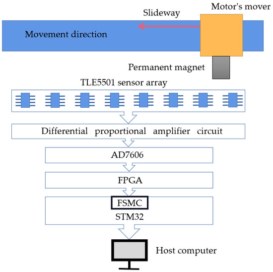 This article describes a position detection method based on the TLE5501 (Infineon Technologies AG, Munich, Germany) magnetoresistive sensor array. The magnetoresistive sensors are arranged at equal intervals along a straight line, and the detection range of each sensor is sequentially “spliced” in the form of an array, arranged in parallel next to the guide rail on which the mover runs. The motion of the mover causes the permanent magnet to pass through the sensor, and the sensor outputs two sinusoidal voltage signals, achieving long-distance linear position detection. Figure 4 is the overall block diagram of the system scheme, including the TLE5501 sensor array, a differential proportional amplification circuit, an AD7606 analog-to-digital conversion module (Shenzhen Convince Technology Co., Ltd., Shenzhen, China), an FPGA and STM32 module (Nexperia Co., Ltd., Shenzhen, China), and the PC host computer.