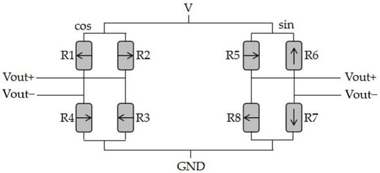 The TLE5501 consists of eight TMR devices. The sensor is made by micromanipulation of magnetoresistive film stack structures. This includes preparing a desired circuit pattern using processes such as photolithography, vapor deposition, and stripping, and then vapor deposition of electrode materials such as gold and copper onto the magnetoresistive film stack structure to form the desired circuit connections. The structure can be described as being equivalent to two Wheatstone bridges [35]. It is shown in Figure 5.