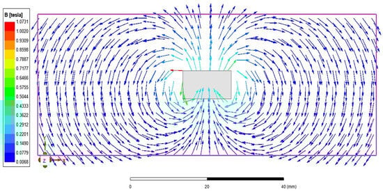 At this time, the magnetization direction of the permanent magnet is parallel to the y-axis. Since the magnetoresistive sensor is only sensitive to magnetic fields parallel to the sensor surface (XY plane), the only need to be focused on is the magnetic field of the permanent magnet in the XY plane. Figure 8 shows the Maxwell simulation of the magnetic induction intensity vector in the XY plane corresponding to case 1.