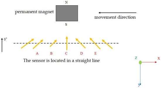 Since the magnetoresistive sensor is only sensitive to magnetic fields parallel to the sensor surface, magnetic fields perpendicular to the sensor surface have little effect on the sensor’s output. The permanent magnet used in this article is a thickness-direction-magnetized permanent magnet. There are two cases regarding the spatial relationship between the sensor and the permanent magnet. The first case is illustrated in Figure 7.