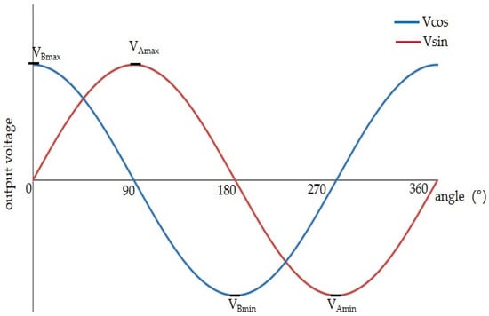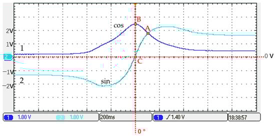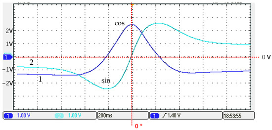 Figure 10 shows the output waveform of the magnetoresistive sensor when the permanent magnet moves parallel to the magnetoresistive sensor along a straight line at a constant speed in case 1. The output waveform of the magnetoresistive sensor is shown in Figure 10. Obviously, when the permanent magnet crosses from one side of the sensor, the angle ranges from −90° to +90°. The cos waveform in this figure is obviously negative, indicating that the angle in this case has a significant deviation, and the angle read by the sensor does not match the actual angle.