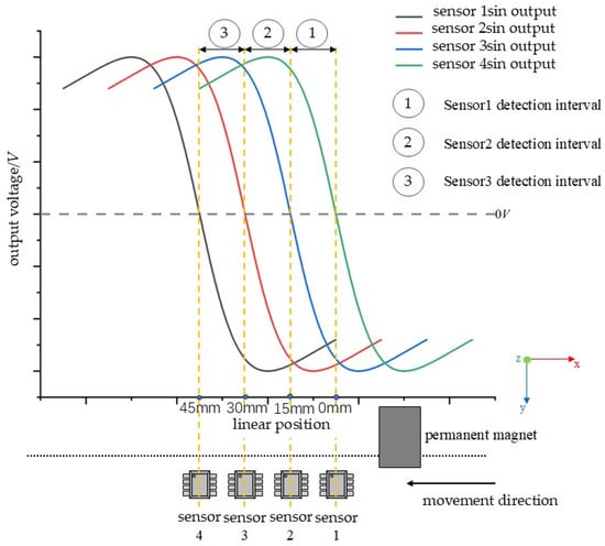 For situations in which there is a piece of permanent magnet in the effective detection range of the TLE5501 magnetoresistive sensor, parallel to the sensor array along the straight line and with movement of a uniform speed, the sin output image of four consecutive TLE5501 sensors is shown in Figure 13.