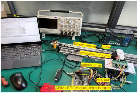 To verify the feasibility of the non-contact linear motor position detection scheme based on a magnetoresistive sensor array, a linear screw module (Guangzhou CNC Equipment Co., Ltd., Guangzhou, China) was used to simulate the linear motion of the rotor. The screw slide table was installed with the mover, which was made by a 3D printer and embedded with permanent magnets. The screw module was driven and controlled by a stepper motor, with a linear positioning accuracy of 0.05 mm. A magnetic scale model MSR5000(HEIDENHAIN Corporation, Degenfeld, Germany) was selected as the position detection comparison, with an accuracy of ±5 μm. The magnetic grid ruler reading head was installed on the slide table and moved simultaneously with the mover.