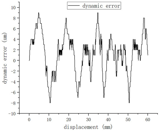 The discrepancy between the measured position and the magnetic encoder’s reading was defined as the dynamic error. Figure 23 shows a graph of the dynamic error test results. Because the spacing of each sensor was recalibrated, only the data from four measurement intervals were selected to illustrate the error range. As can be seen from the graph, the maximum error is within ±9 μm, which meets the accuracy requirements of most industrial applications.