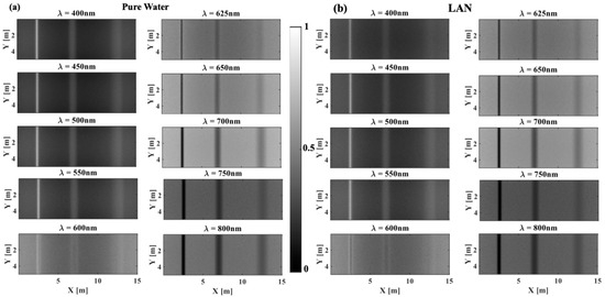 Figure 3 shows the spectral images in the wavelength region of 400–800 nm for selected lakes in the order of increasing concentration of phytoplankton pigment, from pure water (Figure 3a) to LVA (Figure 3e). Here, a constant concentration of chlorophyll (scatterer, C = 10 mg.m−3) is used. Correspondingly, Figure 4 shows the quantitative image contrast spectra at all three depths. In general, contrast decreases with depth, and near infrared (NIR) wavelengths (700–800 nm) produce the best image contrast for intermediate to high concentrations of phytoplankton (LPA, LOV, LVA in Figure 3c–e and Figure 4c–e), whereas shorter wavelengths (400–600 nm) have a slight advantage for zero to low concentrations of phytoplankton (pure water, LAN in Figure 3a,b and Figure 4a,b). For example, considering LVA (with highest concentration of phytoplankton), 800 nm produces a 9× better image contrast than 400 nm for shallow imaging (depth = 2.5 m) and 7.5× for intermediate depth imaging (depth = 5 m). These numbers are roughly 1.5× and 1.8× in pure water (with zero concentration of phytoplankton).