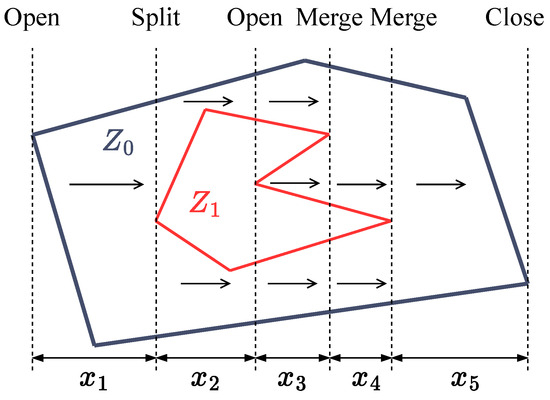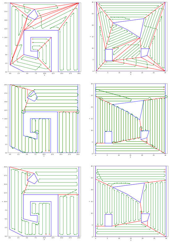In the literature [17,19], minimizing the total number of turns is widely regarded as the optimality criterion utilized for an efficient coverage solution. Because the number of turns is directly linked to each subregion’s generalized width (measured in the sweep direction), our decomposition approach seeks to minimize these widths. Moreover, to enhance overall optimality, the generalized traveling salesman algorithm employed to connect the line segments prioritizes minimizing path lengths while avoiding obstacles, further expanding the optimality and enhancing the applicability of the algorithm.