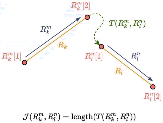 After generating the minimum amount of straight segments R for each polygonal subregion in , we have to appropriately connect them with turn segments T in order to complete the coverage path. Note that each straight segment path has two possible traversal directions, denoted as . We define as the transition cost from segment in direction m to segment in direction n, where and with and . Here, is taken to be the arc length of the turn segment , which connects the end point of and the start point of , as illustrated in Figure 6. Calculating the cost for each pair enables the construction of a complete graph , following [19]. Here, each vertex represents a straight path direction for and , each edge represents a transition between vertices v and z, and weights w represent the respective transition costs between vertices. Because each edge is a straight path direction, it holds that . Finally, V is partitioned into clusters of directions where . The graph with the clusters forms a GTSP instance, whose solution leads to the complete coverage path.