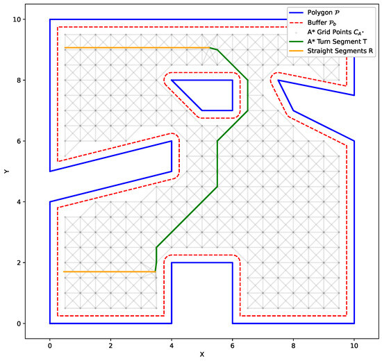 To calculate transition costs of the GTSP instance, we employ a conventional A* algorithm, which enables robust obstacle avoidance and a fully connected graph. First, we construct a grid from the geometry of , as described in Algorithm 1. Then, we use A* to compute the shortest path between the end point of directional segment and the start point of , where . Then, we calculate the distance traveled following the path produced, and we assign that distance as the cost of the transition. As such, in order to complete graph G, we need to compute the transition cost matrix W. The calculation procedure is described in Algorithm 2. An example transition cost calculation inside a uniform A* grid is illustrated in Figure 7.