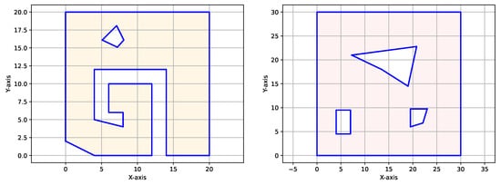 Two polygonal workspaces used to demonstrate the GTSP-A* CPP algorithm. The left-side workspace focuses on the non-convexity of the exterior boundary, while the right-side workspace focuses on the presence of obstacles.