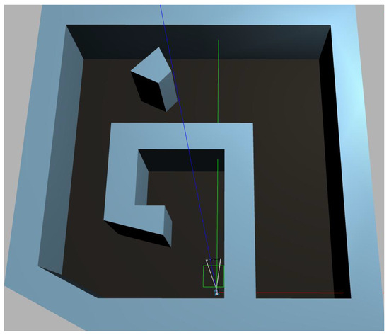 The CPP methodology designed in Section 4.2 along with the controller designed in Section 4.3 are combined, and the results are demonstrated in a simulated Gazebo workspace. The simulated workspace is equivalent to the left-side polygonal workspace constructed in Figure 8 and is equipped with the package “freefloating-gazebo” [42] that simulates underwater buoyancy and viscous forces. The simulated workspace is shown in Figure 10. The results of the proposed controller and path planner are demonstrated in the accompanying video [43].