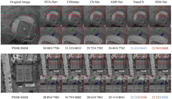 Table 4 shows inference time comparisons on an RTX 4090 GPU. SSM-Net consistently processes images in approximately 0.0202 s across different sampling rates. This stable processing time demonstrates better scalability compared to methods like CSformer, which shows increasing inference times from 0.0469 to 0.0486 s at higher sampling rates. While CSNet achieves faster inference (0.0078–0.0099 s), it produces lower-quality reconstructions as shown by the PSNR results.