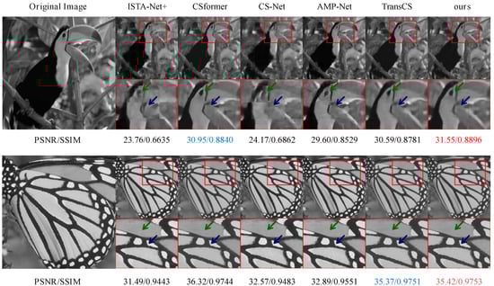 Each dataset presents unique challenges, offering insights into the model’s behavior under different conditions. These datasets also serve as standardized benchmarks, enabling direct comparisons with existing methods such as ISTA-Net+, Csformer [], AMP-Net, CPP-Net [], and TransCS. By incorporating diverse structural patterns, textures, and details, the evaluation framework ensures a rigorous assessment of reconstruction performance. The observed results reflect the model’s ability to adapt to various image characteristics, confirming its effectiveness in reconstructing high-quality images under challenging conditions.